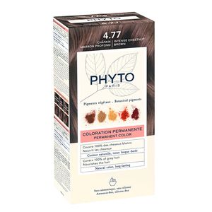 Бренд PHYTOСила природы для красоты волос! Бренд PHYTO разрабатывает формулы из растительных экстрактов, которые тщательно отбирает и проверяет.Линия Phyto Color средства для окрашивания волос чувствительной кожи головы и для ухода за окрашенными волосами.PHYTO КРЕМ-КРАСКА ДЛЯ ВОЛОС ТОН 4.77 НАСЫЩЕННЫЙ ГЛУБОКИЙ КАШТАНВнешний вид: Кремовая текстура, белого цвета (изменяющаяся при контакте с окислителем) с тонким ароматом.Специальные особенности: Без аммиака, без резорцинола, без парабенов, без силиконов.Phyto Permanent color первая крем-краска, разработанная специалистами Фито без аммиака и с использованием растительных пигментов.Формула Phyto Permanent color 4.77 Intense Chestnut Brown Насыщенный глубокий каштан сбалансирована таким образом, чтобы обеспечивать стойкий максимально естественный цвет, сохранить здоровье и сияние локонов, а также проявить заботу, обеспечив комфорт нанесения краски для кожи головы.Фито Крем-Краска содержит до 81% натуральных ингредиентов с высокой переносимостью, обеспечивающих закрашивание 100% седины с первого использования.Высокая концентрация растительных пигментов обеспечивает безукоризненно точное окрашивание (до 81% растительных компонентов в зависимости от оттенка). Красящая основа гарантирует идеальное закрашивание седины и желаемый тон.Растительные пигменты обеспечивают интенсивный цвет, естественный глубокий оттенок и блеск.Два синергичных компонента -масла 100% растительного происхождения восстанавливают красоту волос и насыщают их питательными компонентами.Преимущества: 100% закрашенных седых волос с первого применения, подходит для чувствительной кожи головы, протестировано под дерматологическим контролем, легкий аромат: не содержит аммиака, бархатистая текстура не растекается при нанесении.Результат: Цвет волос яркий и насыщенный, выглядит естественно. Волосы мягкие и блестящие, здоровые и красивые. Седые волосы закрашены.
