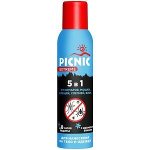 «Пикник Экстрим» аэрозоль от клещей и комаров 5 в 1 объёмом 150 мл предназначен для защиты взрослых людей от нападения кровососущих насекомых, таёжных и лесных клещей.Время защитного действия: на коже — более 4 часов, на одежде — до 30 суток, на одежде от клещей — до 5 суток.