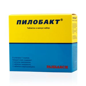Показания к применениюЭрадикационная терапия Н. Pylori при язвенной болезни 12-типерстной кишки.Применение при беременности и кормлении грудьюПротивопоказано при беременности и в период лактации.Противопоказания Повышенная чувствительность к омепразолу, кларитромицину или амоксициллину, а также к антибиотикам группы макролидов; Запрещается сочетанное применение с цизапридом, пимозидом, астемизолом и терфенадином (см. раздел Взаимодействие с другими лекарственными средствами); Беременность; Период лактации; Порфирия; Детский возраст; Почечная и/или печеночная недостаточность. Побочное действиеСо стороны органов пищеварения: дисбактериоз, диарея или запор, тошнота, рвота, метеоризм, боль в животе, сухость во рту, нарушения вкуса, стоматит, транзиторное повышение активностипеченочных ферментов в плазме, нарушение функции печени, редко — псевдомембранозный энтероколит. Со стороны нервной системы: головная боль, головокружение, возбуждение, сонливость, бессонница, атаксия, парестезии, депрессия, спутанность сознания, галлюцинации, эпилептические реакции, периферическая невропатия. Со стороны опорно-двигательного аппарата: мышечная слабость, миалгия, артралгия. Со стороны системы кроветворения: лейкопения, нейтропения, тромбоцитопения, тромбоцитопеническая пурпура, анемия. Со стороны кожных покровов: зуд; редко — кожная сыпь, в отдельных случаях фотосенсибилизация, мультиформная экссудативная эритема, алопеция. Аллергические реакции: крапивница, ангионевротический отек, бронхоспазм и анафилактический шок. Прочие: тахикардия, интерстициальный нефрит, нарушение зрения, периферические отеки, усиление потоотделения, лихорадка, гинекомастия. СоставДействующее вещество: 1 капсула омепразол 20 мг; 1 таблетка кларитромицин 250 мг; 1 таблетка тинидазол 500 мг. Концентрация действующего вещества (мг): 500 мг+250 мг+20 мг