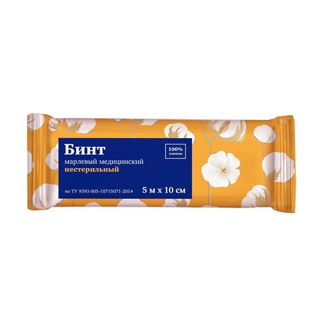 «Бинт марлевый медицинский нестерильный по ТУ 9393-005-10715071-2014, 5 м х 10 см 1 штука. Хранить в сухом месте при температуре от 0 0С до +30 0С. Беречь от огня и влаги. Нетоксично»