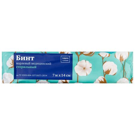 Бинт марлевый медицинский стерильный по ТУ 9393-005-10715071-2014, 7 м х 14 см 1 штука. Хранить в сухом месте при температуре от 0 0С до +30 0С. Беречь от огня и влаги. Нетоксично