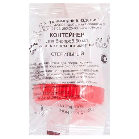 КОНТЕЙНЕР ДЛЯ БИОПРОБ ОДНОРАЗОВЫЙ СТЕРИЛЬНЫЙ С ЛОЖКОЙ — предназначен для использования в целях сбора, сохранения и/или транспортировки диагностических образцов (мочи, кала, мокроты) для анализа и исследований. Объём: 60 мл