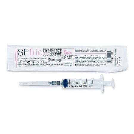 Шприцы стерильные инъекционные однократного применения объемом 5 мл с иглами предназначены для введения инъекционных лекарственных средств в организм человека. Потенциальным потребителем изделия является квалифицированный медицинский персонал.