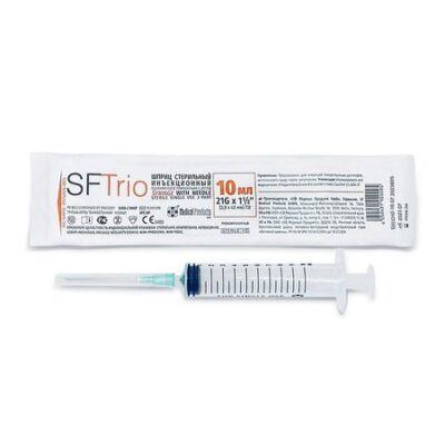 Шприцы инъекционные 3-х компонентные однократного применения стерильный объемом 10 мл с наконечником концентрического типа соответствуют стандарту ГОСТ ISO 7886-1. Шприцы включают в себя цилиндр с силиконовым внутренним покрытием, поршень с уплотнителем и иглу надетую с предохранительным колпачком. Материал цилиндра — полипропилен. Упоры для пальцев не имеет заусенцев и острых краев. Цилиндр полностью прозрачный, для хорошей визуализации содержимого. Шкала — с цифровым обозначением через каждые десять делений — хорошо читаемая, точная, расположена строго параллельно вертикальной оси цилиндра и устойчивая к смыванию и истиранию при использовании. Двойное стопорное кольцо на внутренней поверхности цилиндра предотвращает случайное выдергивание поршня в момент набора лекарственного средства. Полипропиленовый поршень имеет насечки у основания для возможности его принудительного разрушения. Уплотнитель поршня (манжета) изготовлен из полиизопрена транс (гипоаллергенный материал, не содержит латекса) и обработан силиконовой смазкой для плавного и равномерного движения поршня. Манжета имеет кольца для контакта с внутренней поверхностью цилиндра, что исключает протекание. Шприц комплектуется одной надетой на шприц иглой инъекционной со стандартным срезом, с трехгранной заточкой и силиконовым покрытием для атравматического введения и снижения болезненности при проникновении в ткани. Размеры иглы 21G х 1 1/2″ (0,8х40 мм). Цветовая кодировка иглы соответствует требованиям стандарта ГОСТ Р ИСО 6009. Материал канюли иглы – нержавеющая сталь (AISI 304). Предохранительный колпачок иглы имеет пять ребер жесткости, обеспечивающие удобство снятия, и, соответственно, дополнительную безопасность медицинского персонала при снятии колпачка с иглы и уменьшает риск контаминации иглы при снятии колпачка, а также обеспечивает экономию времени для выполнения простой медицинской манипуляции «инъекция». Индивидуальная стерильная блистерная упаковка с отогнутым краем – плотная медицинская бумага и прозрачная пленка (состав пленки — полиэтилен / полиамид). Упаковка вскрывается с небольшим усилием, что предотвращает самопроизвольное вскрытие, без образования бумажной бахромы. Нетоксично, апирогенно. Метод стерилизации — этиленоксид. Срок стерилизации — 5 лет.