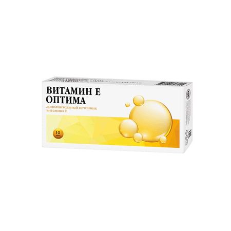 ВИТАМИН Е ОПТИМА Биологически активная добавка (БАД) к пище В суточной дозировке содержится витамина Е — 10мг , что составляет 100% от рекомендуемого суточного потребления. Витамин Е является мощным антиоксидантом, продлевая молодость организма и замедляя естественный процесс старения. Участвует в биосинтезе гема и белков, тканевом дыхании, препятствует повышенной проницаемости и ломкости капилляров; стимулирует синтез коллагена, позволяет улучшить питание кожи и волос, укрепить ногти. Кроме того, он жизненно необходим для нормальной работы репродуктивной системы. Витамин Е способствует улучшению выработки сперматозоидов у мужчин, а у женщин участвует в регуляции менструального цикла и смягчает неприятные симптомы при климаксе.