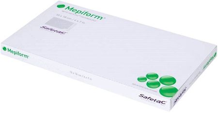 Показан при лечении гипертрофических и келоидных рубцов. Мепиформ размером 10х18 см подходит для больших рубцов. Например, после ожогов. Размер пластыря должен быть больше размера рубца на 1,5-2 см во все стороны. Его можно резать ножницами. Если размер не подходит, то лучше взять Мепиформ другого размера: • Мепиформ 4х30 см — для длинных линейных рубцов. Например, после кесарева сечения. • Мепиформ 5х7,5 см — для маленьких точечных рубцов. Например, после удаления родинок. Силиконовый пластырь Мепиформ работает на свежих и старых гипертрофических и келлоидных рубцах. Силикон в сочетании с компрессионной пластиной создает оптимальную влажность в соединительной ткани рубца, что и приводит к его рассасыванию Мепиформ держится на коже не за счет приклеивания (как в обычных пластырях), а за счет присасывающего эффекта силикона. Именно поэтому один и тот же пластырь можно многократно снимать и наносить снова без потери его адгезивных (от лат. adhaesio — прилипание) свойств. Это уникальный медицинский продукт шведской компании Molnlycke HC. Представляет собой тонкую самоклеющуюся повязку, покрытую мягким силиконовым покрытием Safetac, которое обеспечивает: бережную и удобную адгезию минимальное травмирование рубца и окружающей его кожи не требует дополнительной фиксации заметное снижение болевых ощущений при перевязках достижение максимального результата не происходит отрыва клеток эпителия с поверхности кожи Используя покрытие Safetac, можно избежать: выраженного болевого синдрома дополнительного инфицирования мацерации на коже длительного заживления аллергических проявлений отрыва клеток эпителия при перевязках Силиконовый пластырь Мепиформ успешно применяется как при свежих, так и при старых рубцах и шрамах. Силикон в сочетании с компрессионной пластиной (полиуретан и нетканое полотно), создает в соединительной ткани рубца оптимальную влажность, что и является рычагом для запуска процесса рассасывания образований. Под воздействием Мепиформа, ткани разглаживаются, снижается интенсивность окраски и уменьшается плотность рубца. Для предупреждения грубых рубцов, следует начинать лечение как можно раньше, в период их формирования. Mepiform (Мепиформ) является тонкой и малозаметной самоклеящейся повязкой для профилактики и лечения рубцов и шрамов, с мягким силиконовым покрытием, с технологией Safetac® Силиконовый пластырь Мепиформ не является лекарственным средством, поэтому его можно применять, как детям, так и при беременности. В состав Мепиформа входит чистый силикон, без добавления лекарственных веществ.
