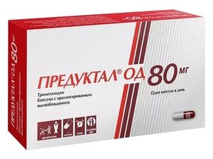 Показания к применениюТриметазидин показан к применению у взрослых пациентов в качестве дополнительной терапии для симптоматического лечения стабильной стенокардии при неадекватном контроле или непереносимости антиангинальной терапии первой линии.Применение при беременности и кормлении грудьюБеременностьДанные о применении триметазидина у беременных отсутствуют. Исследования с участием животных не выявили наличие прямого или непрямого негативного влияния в отношении репродуктивной функции (см. раздел 5.3). В качестве меры предосторожности предпочтительно избегать применения триметазидина во время беременности.Кормление грудьюДанные о выделении триметазидина в грудное молоко отсутствуют. Риск для новорожденного/ребенка не может быть исключен. Лекарственный препарат Предуктал ОД не следует использовать в период грудного вскармливания.Фертильность Изучения репродуктивной токсичности показали отсутствие влияния на фертильность у крыс обоего пола (см. раздел 5.3).Противопоказания Гиперчувствительность к действующему веществу или к любым вспомогательным веществам, перечисленным в подразделе 6.1. Болезнь Паркинсона, симптомы паркинсонизма, тремор, синдром «беспокойных ног» и другие связанные с ними двигательные нарушения. Тяжелая почечная недостаточность (клиренс креатинина < 30 мл/мин). Период беременности и кормления грудью.Состав1 капс.# триметазидина дигидрохлорид (в гранулах) 80 мг. Вспомогательные вещества: сахарные сферы** (710-850 мкм) — 36.Взаимодействие с другими препаратамиНе было выявлено взаимодействий с другими лекарственными препаратами.