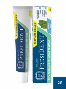 Крем для фиксации зубных протезов PRESIDENT Garant обеспечивает надежную защиту десен при ношении зубных протезов, экстрасильная фиксация до 36 часов благодаря специальной формуле. Крем для протезов заполняет зазоры между челюстью и протезом мягкой упругой прослойкой, защищает пространство под протезами от попадания частиц пищи. Нежный вкус натуральной мяты придает ощущение свежести. Экономичен в применении, не содержит тяжелых металлов и парабенов. Активные компоненты Крема Президент: -Экстракты ромашки и липы снижают риск воспаления десен, -PVM/MA сополимер равномерно распределяется между десной и протезом, заполняя свободное пространство