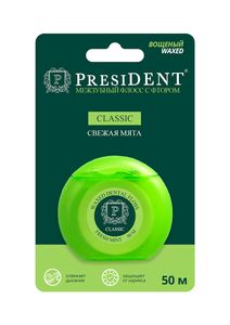PresiDent Classic Свежая мята межзубный флосс с фтором 50 мПрофилактика кариеса на контактных поверхностяхМежзубный флосс (вощеный) с фтором PresiDent Classic удаляет остатки пищи и налет между зубами, надолго освежает дыхание, подходит для любых межзубных промежутков. Длина нити 50 метров.Длина нити 50 м.Активные компоненты: Фтор служит дополнительной профилактикой кариеса Мята освежает дыхание Воск обеспечивает гладкое скольжение