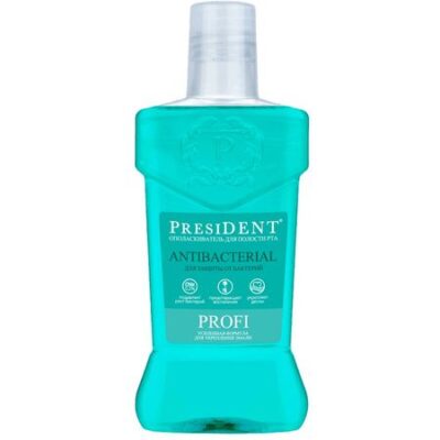 Коллекция специализированных средств по лечению полости рта PRESIDENT PROFI подходит для тех, кому нужен дополнительный уход за зубами и деснами. Формула ополаскивателей коллекции PROFI усилена реминерализующими компонентами. Ополаскиватель для полости рта PRESIDENT PROFI Antibacterial подавляет рост бактерий, предотвращает воспаления, ускоряет заживление. Является эффективным дополнением к зубной пасте President «Antibacterial» и бальзаму President Profi Plus «Effect Balm». Подходит для ирригатора. Не содержит фтор, SLS. Активные компоненты: • Хлоргексидин (0,2%) подавляет рост бактерий • Ромашка и мальва уменьшают воспаление • Комплекс Биодоступного Кальция с Жемчужной Пудрой реминерализует эмаль Внешний вид и свойства: освежающий мятный вкус, цвет морской волны, водная консистенция. Применение: перед употреблением взболтать! Наполнить колпачок ополаскивателем. Полоскать рот в течение 40-60 секунд не менее 2-х раз в день после приема пищи, чистки зубов, а также при необходимости, курсами 2-3 недели с перерывами между курсами 2-3 недели, или согласно рекомендациям Вашего стоматолога. Рекомендуется после хирургических вмешательств, установки имплантов и профессиональной чистки у стоматолога, а также при использовании протезов, ортодонтических конструкций и при наличии коронок.