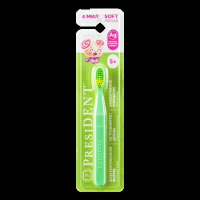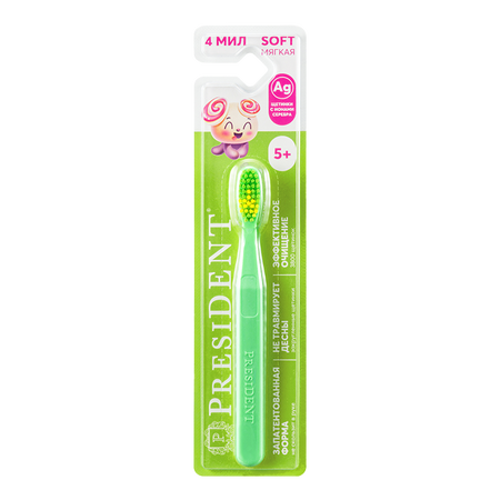 Мягкая зубная щётка PRESIDENT ® для детей от 5-ти лет. Зубная щётка для ежедневного ухода за молочными и постоянными зубами. • С увеличенным количеством щетинок — 3800 штук — эта зубная щётка обеспечивает эффективное очищение зубов и десен. • Специально подобранная жесткость щетины 4МИЛ обеспечивая деликатное очищение от остатков пищи и налета. Идеально закругленные и отполированные щетинки не травмируют нежные десны. • Щетинки с ионами серебра обеспечивают антибактериальный эффект. • Удобная форма ручки позволяет надежно держать щетку во время использования, а гравировка на обратной стороне ручки помогает не скользить щетке в руке. • Не содержит Бисфенол А