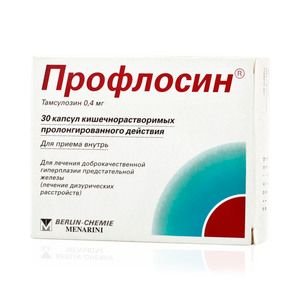 Применение при беременности и кормлении грудьюПри первых признаках ортостатической гипотензии (головокружение, слабость) больного следует усадить или уложить.Перед началом терапии препаратом Профлосин следует исключить наличие у пациента заболеваний и состояний, способных обусловить симптоматику, сходную с таковой при доброкачественной гиперплазии простаты.Перед началом лечения и регулярно во время терапии должно выполняться пальцевое ректальное обследование и, если потребуется, определение концентрации специфического простатического антигена (ПСА).В случае развития ангионевротического отека следует немедленно прекратить терапию препаратом Профлосин . Повторное назначение препарата противопоказано. При оперативном вмешательстве по поводу катаракты на фоне приема препарата возможно развитие синдрома атоничной радужки, что необходимо учитывать хирургу для предоперационной подготовки пациента и при проведении операции.Влияние на способность управлять транспортным средством и другими сложными механизмамиНеобходимо соблюдать осторожность при управлении автотранспортом и занятиями потенциально опасными видами деятельности, требующими повышенной концентрации внимания и скорости психомоторных реакций, в связи с тем, что возможно развитие головокружения.ПротивопоказанияГиперчувствительность к тамсулозину или другим компонентам препарата; ортостатическая гипотензия (в т.ч. в анамнезе); тяжелая печеночная недостаточность. С осторожностью хроническая почечная недостаточность (клиренс креатинина менее 10 мл/мин); артериальная гипотензия.Побочное действиеТамсулозин не взаимодействует с атенололом, эналаприлом, нифедипином и теофиллином.При одновременном применении с циметидином отмечено некоторое повышение концентрации тамсулозина в плазме крови; с фуросемидом — снижение концентрации, однако это не требует корректировки дозы препарата Профлосин, поскольку концентрация препарата остается в пределах нормального диапазона.Диклофенак и варфарин могут увеличивать скорость выведения тамсулозина.Одновременное назначение тамсулозина с другими блокаторами ai-адренорецепторов может привести к снижению артериального давления.СоставДействующее вещество: Тамсулозина гидрохлорид (Tamsulosin hydrochloride)Концентрация действующего вещества (мг): 0,4Взаимодействие с другими препаратамиМеры предосторожности