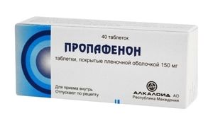 Показания к применениюЛечение и профилактика наджелудочковых и желудочковых экстрасистол, пароксизмальных нарушений ритма (наджелудочковая тахикардия, в т.ч. при синдроме WPW; желудочковая тахикардия).Применение при беременности и кормлении грудьюПрименение при беременности возможно только в том случае, когда предполагаемая польза для матери превышает потенциальный риск для плода.;При необходимости применения в период лактации следует решить вопрос о прекращении грудного вскармливания.ПротивопоказанияТяжелые формы хронической сердечной недостаточности, выраженная артериальная гипотензия, кардиогенный шок, выраженная брадикардия, СССУ, AV-блокада II и III степени, нарушения электролитного баланса, миастения, тяжелые обструктивные заболевания легких, печеночный холестаз, детский возраст, повышенная чувствительность к пропафенону.Побочное действиеСо стороны сердечно-сосудистой системы: возможны брадикардия, замедление синоатриальной, AV и внутрижелудочковой проводимости, снижение сократительной способности миокарда (у предрасположенных пациентов), аритмогенное действие; при приеме в высоких дозах — ортостатическая гипотензия.;Со стороны пищеварительной системы: при приеме в высоких дозах возможны тошнота, анорексия, чувство тяжести в эпигастрии, запор; редко — нарушения функции печени.;Со стороны ЦНС: при приеме в высоких дозах — головная боль, головокружение; редко — нарушение зрения.;Со стороны системы кроветворения: лейкопения, агранулоцитоз, тромбоцитопения.;Со стороны репродуктивной системы: олигоспермия.;Аллергические реакции: редко — кожная сыпь.СоставПропафенона гидрохлорид 150 мг