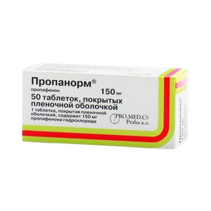 Показания к применению Профилактика и лечение наджелудочковых и желудочковых экстрасистолий Профилактика и лечение пароксизмальных нарушений ритма (наджелудочковые — фибрилляция и трепетание предсердий, синдром Вольфа-Паркинсона-Уайта) Профилактика и лечение предсердно-желудочковой re-entry тахикардии. Профилактика устойчивой мономорфной желудочковой тахикардии Применение при беременности и кормлении грудьюПрименение пропафенона при беременности, особенно в I триместре, возможно только в том случае, когда ожидаемая польза для матери превышает потенциальный риск для плода.Противопоказания Тяжелые формы хронической сердечной недостаточности (в стадии декомпенсации), неконтролируемая хроническая сердечная недостаточность Кардиогенный шок (за исключением артериальной гипотензии, обусловленной тахикардией, и антиаритмического шока) Выраженная брадикардия Выраженная артериальная гипотензия Синоатриальная блокада, нарушение внутрипредсердного проведения Блокада ножек пучка Гиса Внутрижелудочковая бифасцикулярная блокада и AV-блокада II и III степени (без установки электрокардиостимулятора) СССУ Синдром «тахикардии-брадикардии» Инфаркт миокарда Период лактации (грудного вскармливания) Детский и подростковый возраст до 18 лет (эффективность и безопасность не установлены) Интоксикация дигоксином Повышенная чувствительность к компонентам препарата С осторожностью следует назначать препарат в следующих случаях: ХОБЛ Миастения (в т.ч миастения gravis) Сердечная недостаточность (фракция выброса менее 30%) Кардиомиопатия Артериальная гипотензия Печеночный холестаз Печеночная и/или почечная недостаточность Электролитные нарушения (должны быть обязательно скорректированы до назначения пропафенона) Пациенты в возрасте старше 70 лет Пациенты с постоянным или временным электрокардиостимулятором Одновременное назначение с другими антиаритмическими средствами аналогичного действия СоставПропафенона гидрохлорид 150 мг, что соответствует содержанию пропафенона 135.7 мг вспомогательные вещества: целлюлоза микрокристаллическая гранулированная, крахмал кукурузный, коповидон, кроскармеллоза натрия, магния стеарат, натрия лаурилсульфат, гипромеллоза 5, макрогол 6000, титана диоксид, эмульсия диметикона с кремния диоксидом.