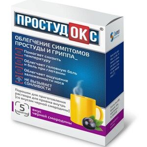 Показания к применению— симптомы простуды и гриппа (повышенная температура, головная боль, озноб, ощущение заложенности носа, боль в горле при глотании).Применение при беременности и кормлении грудьюПротивопоказано применение препарата Простудокс при беременности и в период грудного вскармливания.Противопоказания— заболевания сердечно-сосудистой системы (выраженный аортальный стеноз, острый инфаркт миокарда, тахиаритмия) — артериальная гипертензия — сахарный диабет — гиперплазия предстательной железы — закрытоугольная глаукома — тиреотоксикоз — феохромоцитома — беременность — период лактации — детский возраст (до 14 лет) — одновременный прием трициклических антидепрессантов, бета-адреноблокаторов, ингибиторов МАО (в т.ч. в течение 14 дней после их отмены) — одновременный прием с другими парацетамолсодержащими препаратами — повышенная чувствительность к компонентам препарата. Следует с осторожностью применять препарат при почечной/печеночной недостаточности, врожденных гипербилирубинемиях (синдромы Жильбера, Дубина-Джонсона и Ротора), ХОБЛ, дефиците глюкозо-6-фосфатдегидрогеназы, заболеваниях крови, у пациентов пожилого возраста.Побочное действиеАллергические реакции: иногда — кожная сыпь, зуд, крапивница, ангионевротический отек. Со стороны системы кроветворения: редко — тромбоцитопения, лейкопения, агранулоцитоз. Со стороны пищеварительной системы: редко — тошнота, рвота, боль в эпигастрии. Прочие: редко — повышение внутриглазного давления, задержка мочи. При длительном применении с превышением рекомендованной дозы может наблюдаться гепатотоксическое и нефротоксическое действие. Фенилэфрина гидрохлорид может вызвать тошноту, головную боль, повышение АД; редко — ощущение сердцебиения. Эти симптомы проходят после отмены препарата.Состав1 пак. парацетамол 750 мг фенилэфрина гидрохлорид 10 мг аскорбиновая кислота 60 мг. Вспомогательные вещества: натрия цитрата пентагемигидрат, лимонная кислота, натрия сахаринат, ароматизатор смородиновый (ароматизатор пищевой порошкообразный «черная смородина»), сахар.