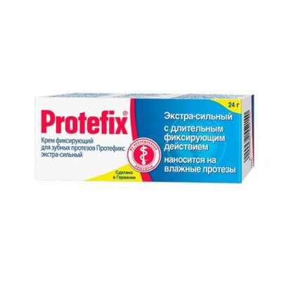Бренд Protefix (Протефикс)Protefix Крем фиксирующий для зубных протезов Протефикс экстра-сильный — практически немедленно возникает сильная фиксацияВнешний вид и свойства: гомогенная и мягкая до слегка зернистой паста малинового цвета, крем для фиксации зубных протезовСильная фиксация возникает практически немедленно и продолжается на протяжении 8-12 часов.Применять только при здоровой слизистой оболочке полости рта!Пользуйтесь экстра-сильным фиксирующим кремом Protefix® очень экономно, так как передозировка снижает удерживающую способность крема.