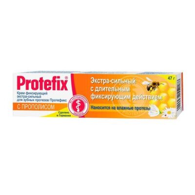 Прополис – биологически активное вещество, вырабатываемое в пчелином организме во время переработки собранных с почек деревьев клейких веществ. Благодаря богатому составу прополис обладает противомикробным, противовоспалительным, иммуномодулирующим и антиоксидантным действием, что доказано во многих клинических исследованиях. Использование Крем фиксирующий экстра-сильный для зубных протезов с Протефикс с прополисом Protefix® способствует заживлению ран и натёртостей в ротовой полости, а также способствует улучшению качества фиксирующего свойства крема, повышает герметизацию протезов.