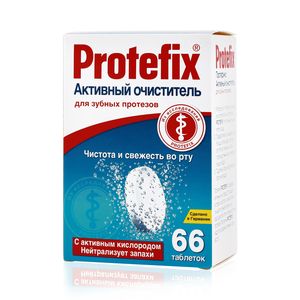 Protefix Очиститель активный для зубных протезов сохраняет свежий запах во рту.Внешний вид и свойства: таблетки голубовато-белого цвета с небольшими вкраплениями, с ароматом мяты.В течение дня в полости рта скапливаются остатки пищи, что обуславливает необходимость тщательной гигиены полости рта. Зубные протезы отрицательно влияют на состояние микрофлоры полости рта и нарушают процесс естественного самоочищения. Все это вызывает воспалительные процессы, образование налета и, как результат, неприятный запах во рту. Именно поэтому, одной только чистки протезов зубной щеткой недостаточно, необходимы специальные средства для ежедневного ухода за зубными протезами. Особенно хорошо в качестве таких средств зарекомендовали себя таблетки Protefix®. Они содержат активный кислород, очищают протезы, уничтожают запахи, не разрушая при этом ценный материал, из которого изготовлены протезы, надолго сохраняют свежий запах во рту.Результат: очищает протезы, уничтожает запахи, не разрушая при этом ценный материал, из которого изготовлены протезы, надолго сохраняет свежий запах во рту.