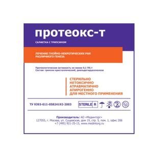 Салфетка марлевая четырехслойная с трипсином для ускоренного лечения гнойно-некротических ран, стерильная «Протеокс-Т».Механизм действияФермент трипсин обладает протеолитическим, противовоспалительным и стимулирующим регенерацию действием. Трипсин растворяет некротизированные белковые массы и, словно «химический скальпель», очищает раневую поверхность от некрозов и нагноений без повреждения живых тканей. Модифицированная целлюлоза обеспечивает дренирующий эффект, впитывая раневое отделяемое. При этом на поверхности раны образуется тонкая гелевая пленка, которая обеспечивает неприлипаемость салфетки к ране.Форма выпускаПо одной салфетке запаивают в пакет из полиэтилена, далее помещают во второй пакет из ламинированной бумаги и также запаивают.