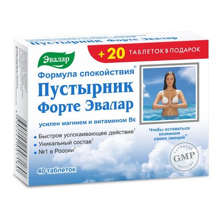ПУСТЫРНИК ФОРТЕ ЭВАЛАР — Биологически активная добавка (БАД) к пище — быстрое успокаивающее действие. Внешний вид и свойства: таблетки круглые, двояковыпуклые, покрытые оболочкой. Цвет ядра на изломе от серого до бежевого цвета с вкраплениями. Оболочка таблеток — с вкраплениями коричневого цвета (так как в составе оболочки отсутствует белый краситель диоксид титана). Содержание в 2 таблетках (суточном приеме) и % от рекомендуемого уровня суточного потребления (адекватного уровня) Магний 24 мг — 6% Экстракт пустырника 100 мг (в том числе лютеолин 250 мкг) Витамин B6 (пиридоксин) 1,6 мг — 80% (Допускаются отклонения в соответствии с ТУ 9100-253-21428156-14). Пустырник Форте Эвалар — фитокомплекс для ежедневной поддержки вашего спокойствия: это высокий седативный эффект, быстрое успокаивающее действие и уникальный состав (патент РФ 2361599). В упаковку входит 60 таблеток, 20 из которых вы получаете в подарок! В его уникальном составе содержится именно тот сорт пустырника сердечного, который произрастает на Алтае и обладает одним из самых высоких показателей седативности. Кроме того, только в Пустырнике Форте Эвалар высокая суточная дозировка пустырника (100 мг) усилена «элементами спокойствия» магнием и витамином В6. Именно комплекс магния и витамина В6 придает пустырнику усиленный эффект — эффект «форте» — расширяя спектр его влияния и повышая эффективность. Большинство покупателей чувствуют разницу и выбирают именно Пустырник Форте от компании Эвалар. Почувствуйте и вы разницу с Пустырником Форте Эвалар! КОМПОНЕНТЫ, ВХОДЯЩИЕ В СОСТАВ ТАБЛЕТОК, СПОСОБСТВУЮТ: • Быстрому снятию эмоционального напряжения и раздражительности; • Улучшению эмоционального состояния; • Повышению устойчивости к стрессам; • Расслаблению мышц и релаксации; • Поддержке сердечно-сосудистой системы. Если у вас раздражительность, повышенная утомляемость, пониженная концентрация внимания, значит, пришло время оказать поддержку нервной системе. Дневное успокаивающее Пустырник Форте Эвалар поэтапно устранит признаки стресса: холодные руки, мышечные спазмы, желание куда-то бежать, и организм с благодарностью расслабится. На все происходящее вы будете реагировать спокойно, не теряя головы и здоровья. Регулярный прием пустырника Форте эвалар поможет вам в течение дня справиться с проблемами и вернуть душевное равновесие, не вызывая при этом сонливости. БИОЛОГИЧЕСКИ АКТИВНЫЕ КОМПОНЕНТЫ И ИХ СВОЙСТВА: ПУСТЫРНИК обладает быстрым успокаивающим (седативным) действием, поддерживает нервную систему, способствует улучшению функционального состояния сердечно-сосудистой системы: оказывает умеренное гипотензивное действие (снижение давления, в т.ч. вызванного стрессом); оказывает умеренное кардиотоническое действие (замедление ритма и увеличение силы сердечных сокращений). МАГНИЙ является незаменимым элементом, содержится во всех клетках и тканях организма. Играет важную роль в процессах мышечной и нервной возбудимости организма, необходим для передачи нервных импульсов, способствует расслаблению, снижению возбудимости нервной системы, поэтому его иногда называют «элементом спокойствия». В сочетании с витамином В6 магний лучше усваивается организмом. ВИТАМИН В6 необходим для нормального функционирования центральной и периферической нервной системы, что помогает кон