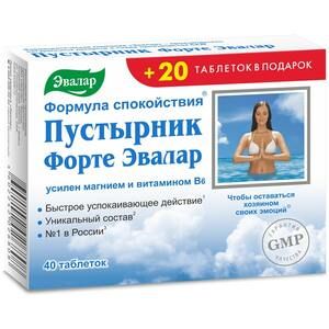 Быстрое успокаивающее действие. Алтайский пустырник с высокой седативностью в высокой дозировке – 100 мг, усиленный «элементами спокойствия» – магнием и В6.Активное вещество: экстракт пустырника сердечного, магний, витамин В6Действие: успокаивающее действие, поддержка сердечно-сосудистой системыПустырник Форте Эвалар способствует быстрому снятию нервного напряжения и раздражительности, улучшению эмоционального состояния.В его уникальном2 составе – именно тот сорт пустырника сердечного, который произрастает на Алтае и обладает одним из самых высоких показателей седативности.Кроме того, только в Пустырнике Форте Эвалар высокая суточная дозировка пустырника (100 мг) усилена «элементами спокойствия» магнием и витамином В6.Пустырник Форте Эвалар отличается экологичным составом: в его оболочке отсутствует диоксид титана, окрашивающий ее в белый цвет. В связи с этим таблетка имеет неоднородный окрас с естественными вкраплениями.Большинство покупателей чувствуют разницу и выбирают именно Пустырник Форте от компании Эвалар.Компоненты Пустырник Форте способствуют: Быстрому снятию эмоционального напряжения и раздражительности, Улучшению эмоционального состояния, Поддержке сердечно-сосудистой системы, Повышению устойчивости к стрессам, Расслаблению мышц и релаксации, Улучшению сна. Поддержке сердечно-сосудистой системы.Дневное успокаивающее Пустырник Форте поэтапно устранит признаки стресса: холодные руки, мышечные спазмы, желание куда-то бежать, и организм с благодарностью расслабится. На все происходящее вы будете реагировать спокойно, не теряя головы и здоровья.Биологически активные компоненты и их свойства:Пустырник обладает быстрым успокаивающим (седативным) действием, поддерживает нервную систему, способствует улучшению функционального состояния сердечно-сосудистой системы: оказывает умеренное гипотензивное действие (снижение давления, в т.ч. вызванного стрессом), оказывает умеренное кардиотоническое действие (замедление ритма и увеличение силы сердечных сокращений).Магний является незаменимым элементом, содержится во всех клетках и тканях организма. Играет важную роль в процессах мышечной и нервной возбудимости организма, необходим для передачи нервных импульсов, способствует расслаблению, снижению возбудимости нервной системы, поэтому его иногда называют «элементом спокойствия». В сочетании с витамином В6 магний лучше усваивается организмом.Витамин В6 необходим для нормального функционирования центральной и периферической нервной системы, что помогает контролировать эмоции. Способствует лучшему усвоению магния.Именно комплекс магния и витамина В6 придает пустырнику усиленный эффект – эффект «Форте» – расширяя спектр его влияния и повышая эффективность.Пустырник Форте – фитокомплекс для ежедневной поддержки сердечно-сосудистой и нервной системы по выгодной цене.Пустырник Форте – оставаться хозяином своих эмоций!