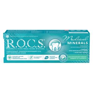 Реминерализующий гель R.O.C.S. Medical предназначен для профилактики кариеса, эффективен при кариесе в стадии белого пятна, позволяет существенно улучшить внешний вид зубов при флюорозе, снимает повышенную чувствительность зубов, позволяет восстановить внешний вид зубов после лечения брекет-системами, осветляет зубы (в среднем на 4,8 оттенка), возвращает зубам блеск, нормализует состав микрофлоры полости рта.