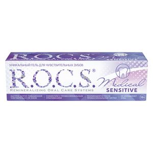 Гель реминерализующий R.O.C.S. Medical Sensitive. Для чувствительных зубовАктивные компонентыКалия нитрат — один из наиболее эффективных десенситайзеров.Кальций, фосфор и магний — источники структурных элементов эмали зуба, укрепляющих эмаль.Ксилит повышает реминерализующий потенциал комплекса, а так же подавляет активность бактерий, вызывающих кариес и болезни десен.Формирует стабильную пленку, продлевающую время экспозиции активных компонентов и обеспечивающую пролонгированное действие.Механизм действияКалия нитрат — один из наиболее эффективных десенситайзеров быстро снимает болевые симптомы.Активные ионы образуются из глицерофосфата кальция под воздействием слюны и легко проникают в ткани зуба.Биодоступные соединения кальция, фосфора и магния укрепляют эмаль. Тонкая невидимая плeнка геля задерживается на зубах на длительное время, что обеспечивает продолжительное, постепенное проникновение активных компонентов в ткани зуба.Ксилит повышает реминерализующий потенциал комплекса, а так же подавляет активность бактерий, вызывающих кариес и болезни десен.Свойства компонентов Ксилит защищает от бактерий, вызывающих кариес. Кальций укрепляет эмаль, возвращает ей естественную белизну. Компоненты в составе замедляют образование окрашиваний, способствуют сохранению белизны и блеска. Биодоступное соединение кальция, фосфора и магния укрепляют эмаль и интенсивно насыщают ее минералами. Комбинированое действие нитрата калия и глицерофосфата кальция быстро снимает болевые симптомы.
