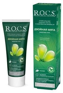 Зубная паста R.O.C.S. «Двойная мята»Активные компонентыЛечебно-профилактическая зубная паста R.O.C.S. для взрослых содержит комплекс MINERALIN®, представляющий собой запатентованную комбинацию ингредиентов: натуральный протеолитический фермент бромелаин, ксилит, глицерофосфат кальция, хлорид магния.Механизм действияMINERALIN®: состав и свойстваБРОМЕЛАИН — очищенный фермент из плодов и стеблей ананаса — бережно растворяет зубной налет, препятствует фиксации бактерий на зубах и слизистой рта, обладает противовоспалительными свойствами. Более 30 лет с успехом применяется в разных областях медицины, в том числе, и в составе фармацевтических препаратов и имеет высокую клиническую эффективностьКСИЛИТ — (источник – зерновые культуры) в высоких концентрациях защищает от бактерий, вызывающих кариес, обладает свойствами пребиотика, способствует усвоению кальцияГЛИЦЕРОФОСФАТ КАЛЬЦИЯ И ХЛОРИД МАГНИЯ — родственные и дружественные организму минералы — укрепляют эмаль и дентин, возвращают белизну*Свойства компонентовБромелаин — фермент растительного происхождения бережно растворяет зубной налет. Ксилит защищает от бактерий, вызывающих кариес. Кальций укрепляет эмаль, возвращает ей естественную белизну. Компоненты в составе замедляют образование окрашиваний, способствуют сохранению белизны и блеска.
