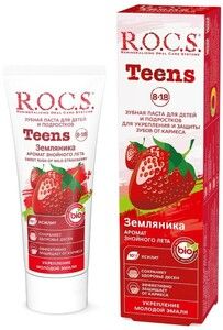 «R.O.C.S.» («Р.О.К.С.») Teens. Sweet Rush of Wild Strawberry (Тинз. Аромат знойного лета. Земляника)Эффективная зубная паста для детей от 8 до 18 летАктивные компоненты КСИЛИТ 10% защищает от кариесогенных бактерий* и нормализует баланс микрофлоры полости рта, способствует включению кальция в эмаль зубов. ГЛИЦЕРОФОСФАТ НАТРИЯ — органическое соединение с высоким уровнем биодоступности фосфата для глубокой реминерализации эмали зубов с использованием физиологических механизмов слюны. ФТОРИД повышает устойчивость эмали в ситуации кислотной атаки, микротвердость поверхности зубов.*Подтверждено клиническими исследованиямиМеханизм действия Механизм противокариозного действия фторидов реализуется в повышении устойчивости эмали зубов к растворяющему действию кислот. Мы отдаем предпочтение органическим солям фтора, так как данные клинических исследований противокариозной эффективности аминофторидов демонстрируют их более высокий потенциал по сравнению с неорганическими солями фтора. Включенный в состав формулы КСИЛИТ обладает высоким противокаризным действием за счет влияния на болезнетворную микрофлору полости рта, стабилизирует pH слюны и повышает включение кальция в эмаль зубов.Свойства компонентов Ксилит защищает от бактерий, вызывающих кариес. Кальций укрепляет эмаль, возвращает ей естественную белизну. Аминофторид — источник фтора, обеспечивает быстрое (всего за 20 секунд) формирование высокостабильного защитного слоя на поверхности зубов.