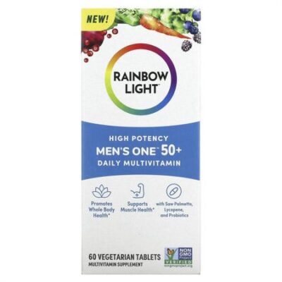 Описание Способствует здоровью всего телаПоддержка здоровья мышцС серой, ликопином и пробиотикамиМультивитаминная добавкаСертификат Non-GMO Project VerifiedСертификат R.A.W.™Сертификат C.L.E.A.N.™Без глютенаВсего одна таблетка в день для питания каждой части телаСодержит минералы, готовые к употреблению Способствует нормальной работе мышцПоддерживает работу иммунных клеток (с витаминами C, D и цинком)Поддерживает здоровую работу мозгаСодержит заряд энергии для вашего дня Ежедневные мультивитамины для мужчин от 50+ Rainbow Light ™ Men’s One ™ содержат широкий спектр питательных веществ, поддерживающих активный образ жизни мужчин в возрасте 50 лет и старше. Эти высокоэффективные мультивитамины с готовыми к усвоению минералами созданы для поддержки оптимального питания и восстановления, обеспечивая прочную основу сегодня и каждый день. Рекомендации по применению Мужчинам в возрасте 50 лет и старше принимать по одной таблетке в день во время еды или между приемами пищи. Ингредиенты Микрокристаллическая целлюлоза, кроскармеллоза натрия, мальтодекстрин, гидроксипропилметилцеллюлоза, оболочка (гидроксипропилцеллюлоза, гипромеллоза).Не содержит пшеницы, молоко, древесные орехи, арахис, сои, яиц, рыбы, моллюсков. Предупреждения Хранить в недоступном для детей месте. Проконсультируйтесь с врачом перед использованием этого продукта, если вы принимаете какие-либо препараты или при наличии заболеваний. Защита от вскрытия. Не используйте, если защитная пленка на флаконе повреждена или отсутствует. Пищевая ценностьРазмер порции: 1 таблеткаПорций в упаковке: 60 Количество в 1 порции% от суточной нормыВитамин A (в виде бета-каротина)900 мкг100%Витамин С (аскорбиновая кислота)90 мг100%Витамин D (в виде холекальциферола)50 мкг250%Витамин E (в виде d-альфа-токоферил сукцината)15 мг100%Витамин K (в виде фитонадиона)100 мкг83%Тиамин (в виде мононитрата тиамина)6 мг500%Рибофлавин (витамин B2)5 мг385%Ниацин (в виде никотинамида)20 мг125%Витамин В6 (в виде пиридоксина гидрохлорида)20 мг1176%Фолат (в виде фолиевой кислоты)400 мкг пищевого фолатного эквивалента (DFE) (240 мкг фолиевой кислоты)100%Витамин В12 (в виде метилкобаламина)10 мкг417%Биотин30 мкг100%Пантотеновая кислота (в виде пантотената кальция)10 мг200%Холин (в виде битартрата холина)55 мг10%Кальций (из красных водорослей (Lithothamnion sp.))75 мг6%йодин (из инактивированных дрожжей (Saccharomyces cerevisiae))150 мкг100%Магний (в виде оксида магния из морской воды)75 мг18%Цинк (в виде цитрата цинка)11 мг100%Селен (в виде комплекса L-метионина и селена)55 мкг100%Медь (в виде хелата меди)0,9 мг100%Марганец (в виде цитрата марганца)2,3 мг100%Хром (в виде пиколината хрома)100 мкг286%Молибден (в виде хелатного глицината молибдена)45 мкг100%Органическая смесь суперфудов Rainbow
