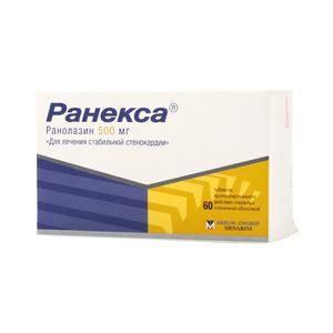 Показания к применениюСтабильная стенокардия.Применение при беременности и кормлении грудьюВ связи с отсутствием данных применение препарата Ранекса при беременности и в период грудного вскармливания противопоказано.Данных о применении ранолазина у беременных женщин не имеется.Проникновение ранолазина в грудное молоко не исследовалось.ПротивопоказанияПовышенная чувствительность к компонентам препарата; почечная недостаточность тяжелой степени (КК меньше 30 мл/мин); печеночная недостаточность средней (7-9 баллов по классификации Чайлд-Пью) или тяжелой (более 9 баллов по классификации Чайлд-Пью) степени; одновременное применение с мощными ингибиторами изофермента CYP3A4 (итраконазол, кетоконазол, позаконазол, ингибиторы ВИЧ-протеазы, кларитромицин, телитромицин, нефазодон); одновременное применение с антиаритмическими средствами класса I A (например, хинидин) или класса III (например, дофетилид), кроме амиодарона; соталолом; детский и подростковый возраст до 18 лет (эффективность и безопасность препарата не установлены); беременность; период грудного вскармливания; дефицит лактазы, наследственная непереносимость лактозы, синдром глюкозо-галактозной мальабсорбции (только для 1000 мг);СоставДействующее вещество: РанолазинКонцентрация действующего вещества (мг): 500