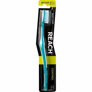 Щетка Reach Control бережно чистит зубы вдоль линии десен благодаря длинным щетинкам. Для максимального контроля во время чистки на ручке есть специальная резиновая накладка, поэтому щётку удобно держать в руках. Изогнутая форма корпуса обеспечивает эффективную гигиену полости рта даже в труднодоступных местах.Щетка средней жесткости – наиболее распространенный вариант, оптимальный для людей, не имеющих серьезных стоматологических отклонений. Длинные внешние щетинки бережно чистят зубы вдоль линии десен. Изогнутая ручка обеспечивает лучшую чистку. Ручка с резиновой накладкой обеспечивает удобный захват и препятствуют скольжению в руке, обеспечивая максимальный контроль во время чистки.