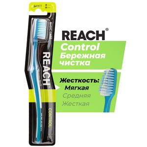 REACH Зубная щетка Control Бережная чистка, мягкая. Щетка бережно чистит зубы вдоль линии десен благодаря длинным щетинкам. Для максимального контроля во время чистки на ручке есть специальная резиновая накладка, поэтому щётку удобно держать в руках. Изогнутая форма корпуса обеспечивает эффективную гигиену полости рта даже в труднодоступных местах. Мягкая щетка обеспечивает наиболее деликатный уход за эмалью и деснами при повышенной чувствительности зубов.