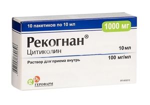 Показания к применениюОстрый период ишемического инсульта (в составе комплексной терапии).Восстановительный период ишемического и геморрагического инсультов.Черепно-мозговая травма, острый (в составе комплексной терапии) и восстановительный периоды.Когнитивные и поведенческие нарушения при дегенеративных и сосудистых заболеваниях головного мозга.Применение при беременности и кормлении грудьюДанных по применению цитиколина при беременности недостаточно. Назначение препарата Рекогнан возможно только в тех случаях, когда ожидаемая польза терапии для матери превосходит потенциальный риск для плода. В исследованиях на животных отрицательного влияния не выявлено. При назначении препарата Рекогнан в период лактации женщинам следует прекратить грудное вскармливание, поскольку данные о выделении цитиколина с грудным молоком у человека отсутствуют.ПротивопоказанияГиперчувствительность к любому из компонентов препарата. Больные с выраженной ваготонией (преобладание тонуса парасимпатической части вегетативной нервной системы). Редкие наследственные заболевания, связанные с непереносимостью фруктозы. Детский возраст до 18 лет (в связи с отсутствием достаточных клинических данных). С осторожностью: информации об относительных противопоказаниях при применении препарата нет.Побочное действиеОчень редко (меньше1/10000) (включая индивидуальные случаи)Аллергические реакции (сыпь, кожный зуд, анафилактический шок), головная боль, головокружение, чувство жара, тремор, тошнота, рвота, диарея, галлюцинации, отеки, одышка, бессонница, возбуждение, снижение аппетита, онемение в парализованных конечностях, изменение активности печеночных ферментов. В некоторых случаях препарат Рекогнан может стимулировать парасимпатическую систему, а также оказывать кратковременное действие на уровень АД.Если любые из указанных в описании побочных эффектов усугубляются или были замечены любые другие побочные эффекты, не указанные в описании, следует сообщить об этом врачу.СоставРаствор для приема внутрь 100 мл, активное вещество: цитиколина мононатриевая соль 10,45 г (эквивалентно 10 г цитиколина), вспомогательные вещества: сорбитол — 20 г, глицерол — 5 г, пропиленгликоль — 1,04 г, метилпарагидроксибензоат — 0,16 г, пропилпарагидроксибензоат — 0,04 г, калия сорбат — 0,14 г, натрия цитрата дигидрат — 0,6 г, натрия сахаринат — 0,02 г, краситель азорубин (Е122) — 0,002 г, ароматизатор клубничный FRESA S. 1487S — 0,04 г, лимонная кислота — до рН 6, вода очищенная — до 100 млВзаимодействие с другими препаратамиЦитиколин усиливает эффекты леводопы. Не следует назначать одновременно с лекарственными средствами, содержащими меклофеноксат.