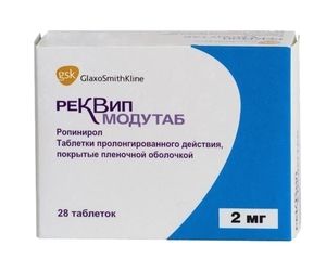 Показания к применениюБолезнь Паркинсона: — монотерапия ранних стадий заболевания у пациентов, нуждающихся в допаминергической терапии, чтобы отсрочить назначение препаратов леводопы; — в составе комбинированной терапии у пациентов, получающих препараты леводопы, с целью повышения эффективности леводопы, включая контроль флуктукаций терапевтического действия леводопы (феномен «включения-выключения») и эффекта «конца дозы» на фоне хронической терапии леводопой, а также в целях снижения суточной дозы леводопы.Применение при беременности и кормлении грудьюПротивопоказано применение при беременности и в период лактации (грудного вскармливания).Противопоказания— острый психоз; — нарушения функции печени; — тяжелые нарушения функции почек (КК менее 30 мл/мин), которым не проводится регулярный гемодиализ; — редкие наследственные заболевания: непереносимость лактозы, лактазная недостаточность, нарушения всасывания глюкозы или галактозы; — беременность; — лактация; — детский и подростковый возраст до 18 лет; — повышенная чувствительность к компонентам препарата.;С осторожностью следует применять препарат у пациентов с тяжелой сердечно-сосудистой недостаточностью. Ропинирол можно назначать пациентам с психотическими расстройствами в анамнезе только в тех случаях, если ожидаемая польза от его применения превышает потенциальный риск.СоставРопинирола гидрохлорид* 2.28 мг,;что соответствует содержанию ропинирола 2 мг;Вспомогательные вещества: верхний барьерный слой**: гипромеллоза 2208 — 62.83 мг, глицерил дибеганат — 35 мг, маннитол — 33.04 мг, повидон К29-32 — 7 мг, магния стеарат — 1.4 мг, кремния диоксид коллоидный — 0.56 мг, железа (III) оксид (желтый) — 0.17 мг; активный слой: гипромеллоза 2208 — 61.5 мг, лактозы моногидрат — 46.32 мг, кармеллоза натрия — 15 мг, масло касторовое гидрогенизированное — 15 мг, мальтодекстрин — 7.5 мг, магния стеарат — 1.5 мг, кремния диоксид коллоидный — 0.9 мг; нижний барьерный слой**: гипромеллоза 2208 — 76.29 мг, глицерил дибеганат — 42.5 мг, маннитол — 40.12 мг, повидон К29-32 — 8.5 мг, магния стеарат — 1.7 мг, кремния диоксид коллоидный — 0.68 мг, железа (III) оксид (желтый) — 0.21 мг.;Состав пленочной оболочки: краситель опадрай OY-S-24900 розовый — 13.8 мг (гипромеллоза 2910 — 66%, титана диоксид — 27%, макрогол 400 — 6.6%, железа (II) оксид (красный) — 0.25%, железа (III) оксид (желтый) — 0.15%).