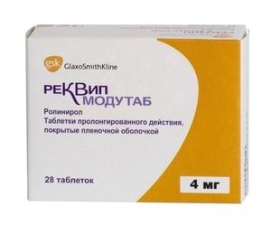 Показания к применениюБолезнь Паркинсона: — монотерапия ранних стадий заболевания у пациентов, нуждающихся в допаминергической терапии, чтобы отсрочить назначение препаратов леводопы; — в составе комбинированной терапии у пациентов, получающих препараты леводопы, с целью повышения эффективности леводопы, включая контроль флуктукаций терапевтического действия леводопы (феномен «включения-выключения») и эффекта «конца дозы» на фоне хронической терапии леводопой, а также в целях снижения суточной дозы леводопы.Применение при беременности и кормлении грудьюПротивопоказано применение при беременности и в период лактации (грудного вскармливания).Противопоказания— острый психоз; — нарушения функции печени; — тяжелые нарушения функции почек (КК менее 30 мл/мин), которым не проводится регулярный гемодиализ; — редкие наследственные заболевания: непереносимость лактозы, лактазная недостаточность, нарушения всасывания глюкозы или галактозы; — беременность; — лактация; — детский и подростковый возраст до 18 лет; — повышенная чувствительность к компонентам препарата.;С осторожностью следует применять препарат у пациентов с тяжелой сердечно-сосудистой недостаточностью. Ропинирол можно назначать пациентам с психотическими расстройствами в анамнезе только в тех случаях, если ожидаемая польза от его применения превышает потенциальный риск.СоставРопинирола гидрохлорид* 4.56 мг,;что соответствует содержанию ропинирола 4 мг;Вспомогательные вещества: верхний барьерный слой**: гипромеллоза 2208 — 62.83 мг, глицерил дибеганат — 35 мг, маннитол — 33.04 мг, повидон К29-32 — 7 мг, магния стеарат — 1.4 мг, кремния диоксид коллоидный — 0.56 мг, железа (III) оксид (желтый) — 0.17 мг; активный слой: гипромеллоза 2208 — 61.5 мг, лактозы моногидрат — 44.04 мг, кармеллоза натрия — 15 мг, масло касторовое гидрогенизированное — 15 мг, мальтодекстрин — 7.5 мг, магния стеарат — 1.5 мг, кремния диоксид коллоидный — 0.9 мг; нижний барьерный слой**: гипромеллоза 2208 — 76.29 мг, глицерил дибеганат — 42.5 мг, маннитол — 40.12 мг, повидон К29-32 — 8.5 мг, магния стеарат — 1.7 мг, кремния диоксид коллоидный — 0.68 мг, железа (III) оксид (желтый) — 0.21 мг.;Состав пленочной оболочки: краситель опадрай OY-27207 светло-коричневый — 13.8 мг (гипромеллоза 2910 — 62.5%, титана диоксид — 21.25%, макрогол 400 — 6.25%, краситель солнечный закат желтый — 9%, индигокармин — 1%).