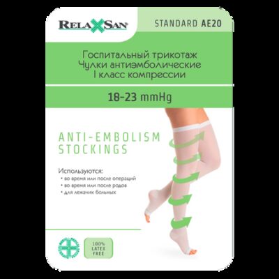 Чулки антиэмболические на резинке К1 стандартСерия MED: для профилактики тромбоэмболических осложнений.Антиэмболические чулки на резинке Relaxsan арт. M0370А — без носка, давление 18-23 мм. рт. ст., I класс компрессии. Лечебные чулки с распределенным давлением, разработаны специально для предотвращения тромбоэмболических проблем. Открытые пальцы позволяют контролировать состояние кровообращения ног.Антиэмболические чулки хорошо и быстро надеваются, не образуют складок.Размеры: 2-МЦвета: БелыйПравила подбора:Подобирать изделия по размеру (см. ниже таблицу подбора типоразмеров на длину ноги 74-84 см).Таблица подбора размеров:1 окружность щиколотки 18 — 21 cm окружность голени в самом шир. месте 26 — 32 cm окружн. бедра 45 — 55 cm2 окружность щиколотки 21 — 24 cm окружность голени в самом шир. месте 32 — 38 cm окружн. бедра 50 — 60 cm3 окружность щиколотки 24 — 27 cm окружность голени в самом шир. месте 38 — 44 cm окружн. бедра 55 — 65 cm4 окружность щиколотки 27 — 30 cm окружность голени в самом шир. месте 44 — 50 cm окружн. бедра 60 — 70 cm5 окружность щиколотки 30 — 33 cm окружность голени в самом шир. месте 50 — 55 cm окружн. бедра 65 — 75 cm