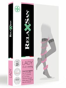 Чулки Relaxsan Stay-up LADY на резинке (арт. 960A) – с компрессией 15-21 мм. рт. ст., 1 класс. Компрессионные чулки полупрозрачные с силиконовой резинкой, укрепленным мыском и пяткой, с массажной стелькой. С матирующим эффектом, позволяют скрыть сосудистую сеточку. Анатомическая форма обеспечивает удобство и хорошую фиксацию изделия.Рекомендуются в случае компенсированной хронической недостаточности, при варикозных венах, отечности. изделия с повышенной прочностью, полупрозрачные, с матирующим эффектом, позволяют скрыть сосудистую сеточку, с массажной стелькой, оказывающей воздействие на биоактивные точки стопы, имеют выраженный лечебный и профилактический эффект при варикозной болезни.Компрессионные чулки LADY K1 производятся из высококачественных материалов, что гарантирует длительный срок их использования и гипоаллергенный эффект при контакте с кожей.