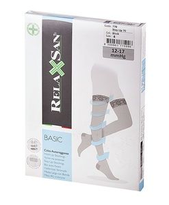 Чулки Relaxsan BASIC 70 den (арт. 770) — с легкой компрессией 12-17 мм. рт. ст. Компрессионные чулки прозрачные, с кружевной силиконовой резинкой, укрепленным мыском и пяткой, уплотненной стопой. Анатомическая форма обеспечивает удобство и хорошую фиксацию изделия.Чулки рекомендуются для профилактики варикозного расширения вен, а также беременным женщинам. Они улучшают кровообращение в ногах, снимают усталость и отечность.Компрессионные чулки BASIC 70 den производятся из высококачественных материалов, что гарантирует длительный срок их использования и гипоаллергенный эффект при контакте с кожей.