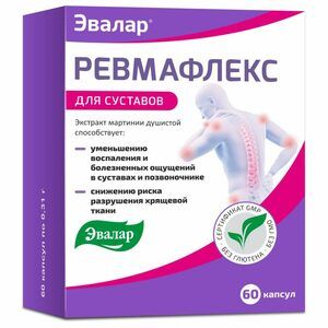 Ревмафлекс – натуральный препарат с высоким содержанием экстракта мартинии душистой для здоровья суставов. В отличие от нестероидных противовоспалительных средств (НПВС), Ревмафлекс не наносит вреда желудку. Он способствует: Улучшению подвижности и гибкости суставов и позвоночника; Уменьшению воспаления и болезненных ощущений в суставах и позвоночнике; Снижению риска разрушения хрящевой ткани; Нормализации уровня мочевой кислоты; Снижению потребности в применении нестероидных противовоспалительных средств (НПВС).Результаты многочисленных экспериментальных и клинических исследований экстракта мартинии душистой подтверждают ее противовоспалительное и обезболивающее действие. Доказано, что выраженность противовоспалительных свойств мартинии исследователи сопоставляют с эффектом НПВС.Механизм действия экстракта подобен действию НПВС, ингибирующих ЦОГ, но шире и лучше. Важным преимуществом данного экстракта является высокий уровень безопасности.Мартинию душистую применяют при ревматизме, миалгии, люмбаго и, особенно, при артритах. Кроме того, растение способствует снижению в сыворотке крови мочевой кислоты, препятствуя ее отложению в суставах и снижая риск возникновения подагры.