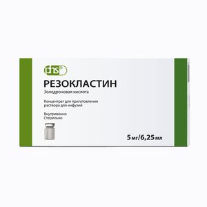 Показания к применениюГиперкальциемия (концентрация скорректированного по альбумину сывороточного кальция — ≥12 мг/дл или 3 ммоль/л), индуцированная злокачественными опухолями;метастатическое поражение костей при злокачественных солидных опухолях и миеломная болезнь (для снижения риска патологических переломов; компрессии спинного мозга; гиперкальциемии, обусловленной опухолью, и снижения потребности в проведении лучевой терапии);постменопаузная форма первичного остеопороза;сенильная форма первичного остеопороза;вторичный остеопороз;костная болезнь Педжета.Применение при беременности и кормлении грудьюПротивопоказан при беременности и лактации.ПротивопоказанияПовышенная чувствительность к золедроновой кислоте, другим бисфосфонатам или любым другим компонентам, входящим в состав препарата Резокластин ФС;выраженная почечная недостаточность (Cl креатинина — ≤30 мл/мин);беременность;период кормления грудью;детский и подростковый возраст (безопасность и эффективность применения не установлены).С осторожностью следует применять при таких состояниях, как:нарушение функции почек;выраженная печеночная недостаточность (нет данных по применению);бронхиальная астма (при наличии у пациентов гиперчувствительности к ацетилсалициловой кислоте).Побочное действиеАнемия, головная боль, конъюнктивит, тошнота, рвота, анорексия, боли в костях, миалгия, артралгия, генерализованные боли, нарушения функции почек, местные реакции. Гипофосфатемия, повышение сывороточных концентраций креатинина и мочевины, гипокальциемия гриппоподобный синдром (включающий общее недомогание, озноб, жар).СоставЗоледроновая кислота 800 мкгВзаимодействие с другими препаратамиВ качестве растворителей нельзя использовать растворы, содержащие кальций или любые двухвалентные катионы, в частности раствор Рингера лактата.При одновременном применении с противоопухолевыми лекарственными средствами, диуретиками, антибиотиками, анальгетиками клинически значимых взаимодействий не отмечено.Бисфосфонаты и аминогликозиды оказывают однонаправленное влияние на концентрацию кальция в сыворотке крови, поэтому при их одновременном назначении повышается риск развития гипокальциемии и гипомагниемии.Рекомендуется соблюдать осторожность при одновременном применении золедроновой кислоты с препаратами, потенциально обладающими нефротоксическим действием.У пациентов с множественной миеломой возможно повышение риска развития нарушений функции почек при в/в введении бисфосфонатов в комбинации с талидомидом.Препарат Резокластин ФС не следует смешивать с другими лекарственными препаратами.