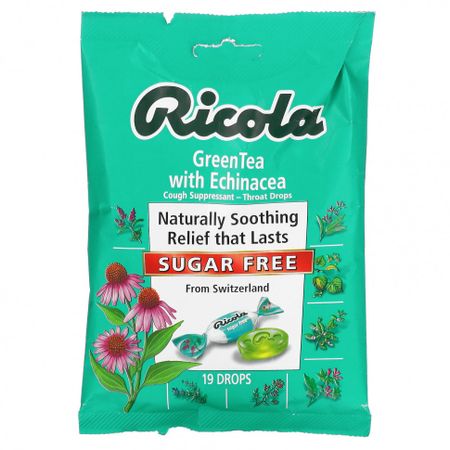 Аспартам, лимонная кислота, экстракты эхинацеи, зелёного чая, мяты перечной мяты и риколаутаиХербклайзер (старина, хорекунд, иссоп, лимонный бальзам, липа, цветы, мальва, мята, шалфей, тимьян, дикий тимьян), изомальт, натуральный цвет (хлорофилл) , натуральные ароматизаторы, сорбит Фенилкетонурикс, содержит фенилаланин 1 мг на каплю. Средство от кашляЛеденцы для горлаНатуральное успокаивающее средство длительного действияСделано в ШвейцарииЕстественное эффективное облегчениеБолее 80 лет компания Ricola производит натуральные эффективные продукты с использованием швейцарских трав высочайшего качества для облегчения кашля и боли в горле.Леденцы Ricola с зеленым чаем и эхинацеей от кашля не содержат сахара. Они имеют мягкий вкус натурального зеленого чая, эхинации и специальной смеси Ricola из швейцарских альпийских трав. Все вместе эти ингредиенты создают неповторимый восхитительный вкус, который отличает продукты компании Ricola.Назначение. Временно смягчает следующие симптомы:кашель при простуде или вдыхании раздражителейпериодическое незначительное раздражение и боль в горле