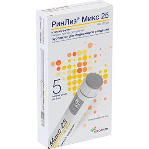 Суспензия белого цвета, которая расслаивается, образуя белый осадок и прозрачную бесцветную или почти бесцветную надосадочную жидкость. Осадок легко ресуспендируется при легком встряхивании. , Гипогликемическое средство — комбинация аналогов инсулинов короткой и средней продолжительности действияРинЛиз, Микс 25 представляет собой готовую смесь, состоящую из раствора инсулина лизпро 25% (аналог человеческого инсулина короткого действия) и суспензии инсулина лизпро протамина 75% (аналог человеческого инсулина средней продолжительности действия). Основным действием инсулина лизпро является регуляция метаболизма глюкозы. Кроме того, он обладает анаболическим и антикатаболическим действием на различные ткани организма. В мышечной ткани происходит увеличение синтеза гликогена, жирных кислот, глицерола, усиление синтеза белка и увеличение потребления аминокислот, но при этом происходит снижение гликогенолиза, глюконеогенеза, кетогенеза, липолиза, катаболизма белков и высвобождения аминокислот. Показано, что инсулин лизпро эквимолярен человеческому инсулину, но его эффект наступает быстрее и длится меньше. Начало действия препарата — примерно через 15 минут, что позволяет вводить препарат непосредственно перед едой (за 0-15 минут до еды), по сравнению с обычным человеческим инсулином. Полнота всасывания и начало эффекта инсулина зависит от места введения (живот, бедро, ягодицы), дозы (объема вводимого инсулина), кровоснабжения, температуры тела и физической активности. После подкожной инъекции препарата РинЛиз, Микс 25 наблюдается быстрое начало действия и раннее наступление пика активности инсулина лизпро. Профиль действия инсулина лизпро протамина похож на профиль действия обычного инсулина-изофан с продолжительностью действия примерно 15 часов. , Фармакокинетика инсулина лизпро характеризуется быстрой абсорбцией и достижением максимальной концентрации в крови через 30-70 минут после подкожной инъекции. Фармакокинетика суспензии инсулина лизпро протамина аналогична таковой инсулина средней продолжительности действия (НПХ). Фармакокинетика препарата РинЛиз, Микс 25 определяется индивидуальными фармакокинетическими свойствами двух компонентов препарата. При введении инсулина лизпро отмечается более быстрое всасывание по сравнению с растворимым человеческим инсулином у пациентов с почечной недостаточностью. У пациентов с сахарным диабетом 2 типа отмечаются фармакокинетические различия между инсулином лизпро и растворимым человеческим инсулином независимо от почечной функции. При введении инсулина лизпро имеет место более быстрое всасывание и более быстрая элиминация по сравнению с растворимым человеческим инсулином у пациентов с печеночной недостаточностью. , Сахарный диабет, требующий проведения инсулинотерапии для поддержания нормальной концентрации глюкозы в крови. , Беременность Многочисленные данные о применении инсулина лизпро в период беременности указывают на отсутствие неблагоприятного влияния инсулина лизпро на беременность или состояние плода и новорожденного. В период беременности основным является поддержание хорошего гликемического контроля у пациенток с сахарным диабетом, получающих лечение инсулином. Потребность в инсулине обычно снижается во время I триместра и увеличив