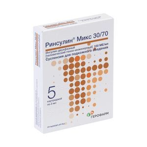 Препарат Ринсулин Микс 30/70, суспензия для подкожного введения, 100 МЕ/мл в картридже представляет собой суспензию белого цвета. При стоянии взвесь оседает. Жидкость над осадком прозрачная бесцветная или почти бесцветная. Осадок легко ресуспендируется при осторожном встряхивании. 1 мл раствора содержит 100 МЕ инсулина человеческого. В каждом картридже содержится 3 мл, соответствующих 300 МЕ инсулина.Характеристика препарата:Препарат Ринсулин® Микс 30/70 содержит в качестве действующего вещества инсулин человеческий, который в норме вырабатывают клетки поджелудочной железы, и представляет собой готовую смесь, состоящую из раствора инсулина человека – 30 % и суспензии инсулина человека протамина – 70 %. Препарат Ринсулин® Микс 30/70 относится к группе «Средства для лечения сахарного диабета, инсулины и их аналоги, инсулины средней продолжительности действия или длительного действия и их аналоги в комбинации с инсулинами короткого действия для инъекционного введения».