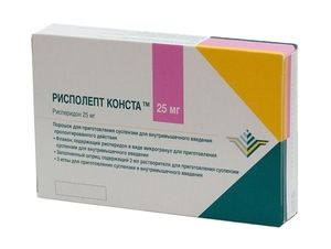 Показания к применениюЛечение и профилактика обострений шизофрении и шизоаффективных расстройств.Применение при беременности и кормлении грудьюБеременность: Данных о безопасности применения рисперидона у беременных женщин нет. В экспериментах на животных рисперидон не оказывал прямого токсического действия на репродуктивную систему, но вызывал некоторые косвенные эффекты, опосредованные через пролактин и ЦНС. Ни в одном из исследований рисперидон не обладал тератогенным действием. В случае если женщина принимала антипсихотические препараты (включая Рисполепт) в третьем триместре беременности, у новорожденных существует риск возникновения экстрапирамидных расстройств и/или синдрома отмены различной степени тяжести. Эти симптомы могут включать ажитацию, гипертонию, гипотонию, тремор, сонливость, респираторные нарушения и нарушение вскармливания. Препарат Рисполепт Конста можно применять во время беременности только в тех случаях, когда потенциальная польза для женщины перевешивает возможный риск для плода. Лактация: В экспериментах на животных рисперидон и 9-гидроксирисперидон экскретируются с молоком. Обнаружено также, что рисперидон и 9-гидроксирисперидон выделяются с молоком человека. Таким образом, женщины, принимающие Рисполепт Конста, не должны кормить грудью.ПротивопоказанияПериод лактации (грудного вскармливания). Детский и подростковый возраст до 18 лет. Повышенная чувствительность к препарату. С осторожностью: Вследствие альфа-адреноблокирующей активности рисперидона у пациентов может возникать ортостатическая гипотензия (особенно в начальный период лечения), в связи с чем рисперидон следует применять с осторожностью у пациентов с сердечно-сосудистыми заболеваниями (например, сердечная недостаточность, инфаркт миокарда, нарушения проводимости сердечной мышцы, включая av-блокаду, обезвоживание, гиповолемия или цереброваскулярные расстройства). У таких пациентов дозу необходимо повышать постепенно. При продолжении клинически значимой артериальной гипотензии необходимо оценить показатель риск/польза дальнейшего лечения препаратом рисполепт конста.Состав1 флакон содержит:Активное вещество: рисперидон — 25 мг.Вспомогательные вещества: сополимер молочной и гликолевой кислот — 619 мг (на 1 г микрогранул).Растворитель: кармеллоза натрия 40 мПа.с — 22.5 мг, полисорбат 20 — 1 мг, натрия гидрофосфата дигидрат — 1.27 мг, лимонная кислота безводная — 1 мг, натрия хлорид — 6 мг, натрия гидроксид — 0.54 мг, вода д/и — до 1 мл.