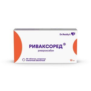 Риваксоред, 15 мг, таблетки, покрытые пленочной оболочкой Круглые двояковыпуклые таблетки красного цвета, покрытые пленочной оболочкой, с гравировкой 15 на одной стороне и гладкие на другой. На поперечном срезе- ядро от белого до почти белого цвета. Характеристика препарата:Действующим веществом препарата Риваксоред® является ривароксабан, который относится к антитромботическим средствам (антикоагулянтам) — препаратам, которые блокируют образование кровяных сгустков (тромбов) и уменьшают вероятность закупорки сосудов кровяными сгустками (тромбоэмболии).