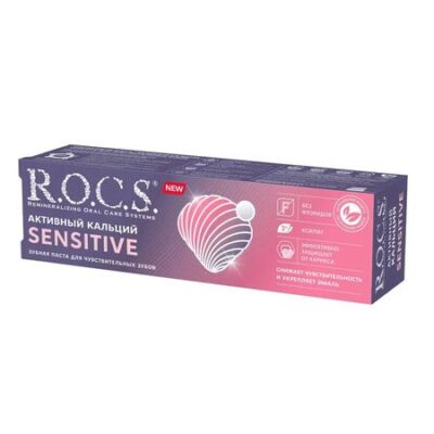 Бренд R.O.C.S. — продукция марки, созданная в современной лаборатории, производится из сырья самого высокого качества. ROCS ЗУБНАЯ ПАСТА SENSITIVE АКТИВНЫЙ КАЛЬЦИЙ ДЛЯ ЧУВСТВИТЕЛЬНЫХ ЗУБОВ — разработана для активной реминерализации эмали и снижения чувствительности зубов. Внешний вид и свойства: Пастообразной консистенции, цвет белый, запах специфический. Имеет освежающий мятный вкус. Возраст: от 18 лет Мультиминеральный комплекс пасты, усиленный ионами калия, обеспечивает двойной механизм снижения чувствительности зубов. Имеет уникальную и безопасную формулу, натуральный состав. Содержит Ксилит 3%. АКТИВНЫЕ ИНГРЕДИЕНТЫ: БИОДОСТУПНЫЙ КАЛЬЦИЙ восстанавливает минерализацию эмали, повышая ее устойчивость к раздражителям. ХЛОРИД КАЛИЯ снижает возбудимость нервных окончаний в дентинных канальцах. КСИЛИТ (3%) — натуральный компонент, который препятствует развитию кариесогенной микрофлоры и формированию зубного налета, а также восстанавливает баланс полезной микрофлоры. Специальные особенности: Не содержит парабенов, лаурилсульфата натрия, фторидов, триклозана, хлоргексидина, диоксида титана. Результат: При регулярном применении R.O.C.S. Активный Кальций SENSITIVE для чувствительных зубов достигается следующий результат: — снижение чувствительности зубов; — укрепление и реминерализация эмали; — защита от кариеса и бактерий; — длительная свежесть дыхания.