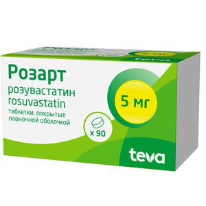 Показания к применению— первичная гиперхолестеринемия (тип IIа по Фредриксону, включая гетерозиготную наследственную гиперхолестеринемию) или смешанная (комбинированная) гиперлипидемия (типа IIb по Фредриксону), в качестве дополнения к диете и другим немедикаментозным мероприятиям (физическая нагрузка и снижение массы тела);;— гомозиготная форма наследственной гиперхолестеринемии при недостаточной эффективности диетотерапии и других видов лечения, направленных на снижение концентрации липидов (например, ЛПНП-аферез) или, если такие виды лечения не подходят пациенту;;— гипертриглицеридемия (тип IV по Фредриксону) в качестве дополнения к диете;;— для замедления прогрессирования атеросклероза в качестве дополнения к диете у пациентов, которым показана терапия для снижения концентрации общего холестерина и холестерина-ЛПНП;;— первичная профилактика основных сердечно-сосудистых осложнений (инсульта, инфаркта, артериальной реваскуляризации) у взрослых пациентов без клинических признаков ИБС, но с повышенным риском ее развития (возраст старше 50 лет для мужчин и старше 60 лет для женщин, повышенная концентрация С-реактивного белка (≥2 мг/л) при наличии, как минимум одного из дополнительных факторов риска, таких как артериальная гипертензия, низкая концентрация холестерина-ЛПВП, курение, семейный анамнез раннего начала ИБС).Применение при беременности и кормлении грудьюПрепарат Розарт противопоказан при беременности и в период лактации.;Применение препарата Розарт у женщин репродуктивного возраста возможно только в случае использования надежных методов контрацепции и если пациентка информирована о возможном риске лечения для плода.;Поскольку холестерин и вещества, синтезируемые из холестерина важны для развития плода, потенциальный риск ингибирования ГМГ-КоА-редуктазы превышает пользу от применения препарата во время беременности. В случае диагностирования беременности в процессе терапии препаратом Розарт, прием препарата должен быть немедленно прекращен, а пациентки предупреждены о потенциальном риске для плода.;Данные в отношении выделения розувастатина с грудным молоком отсутствуют, поэтому при необходимости применения препарата в период лактации, учитывая возможность нежелательных явлений у грудных детей, следует решить вопрос о прекращении грудного вскармливания.СоставРозувастатин кальция 5.21 мг,;что соответствует содержанию розувастатина 5 мг;Вспомогательные вещества: целлюлоза микрокристаллическая (тип 102) — 11.55 мг, кросповидон (тип А) — 3.5 мг, кальция гидрофосфата дигидрат — 17.15 мг, лактозы моногидрат — 31.71 мг, магния стеарат — 0.88 мг.;Состав пленочной оболочки: опадрай белый II 33G28435 ~ 2.1 мг (гипромеллоза-2910 — 0.84 мг, титана диоксид — 0.525 мг, лактозы моногидрат — 0.441 мг, макрогол-3350 — 0.168 мг, триацетин — 0.126 мг).