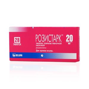 Показания к применению- первичная гиперхолестеринемия (тип IIa по Фредриксону, включая семейную гетерозиготную гиперхолестеринемию) или смешанная гиперхолестеринемия (тип IIb по Фредриксону) в качестве дополнения к диете, когда диета и другие немедикаментозные методы лечения (например, физические упражнения, снижение массы тела) оказываются недостаточными . — гомозиготная форма наследственной гиперхолестеринемии в качестве дополнения к диете и другой липидснижающей терапии (например, ЛПНП-аферез) или в случаях, когда подобная терапия недостаточно эффективна . — гипертриглицеридемия (тип IV по Фредриксону) в качестве дополнения к диете . — для замедления прогрессирования атеросклероза в качестве дополнения к диете у пациентов, которым показана терапия для снижения концентрации общего Хс и Хс-ЛПНП . — снижение риска основных сердечно-сосудистых осложнений (сердечно-сосудистой смерти, инсульта, инфаркта, нестабильной стенокардии и артериальной реваскуляризации) у взрослых пациентов с наличием факторов повышенного риска сердечно-сосудистых осложнений атеросклероза (таких как, повышенная концентрация С-реактивного белка, возраст, артериальная гипертензия, низкая концентрация Хс-ЛПВП, курение и семейный анамнез раннего начала ИБС) . — первичная профилактика основных сердечно-сосудистых осложнений (инсульта, инфаркта, артериальной реваскуляризации) у взрослых пациентов без клинических признаков ИБС, но с повышенным риском ее развития (возраст старше 50 лет для мужчин и старше 60 лет для женщин, повышенная концентрация С-реактивного белка (больше2 мг/л) при наличии, как минимум, одного из дополнительных факторов риска, таких как артериальная гипертензия, низкая концентрация Хс-ЛПВП, курение, семейный анамнез раннего развития ИБС).Применение при беременности и кормлении грудьюРозистарк противопоказан при беременности и в период грудного вскармливания. Женщинам репродуктивного возраста следует применять надежные и адекватные методы контрацепции. Поскольку холестерин и другие продукты биосинтеза холестерина имеют большое значение для развития плода, потенциальный риск ингибирования ГМГ-КоА-редуктазы превышает пользу от применения препарата у беременных. В случае диагностирования беременности в процессе терапии применение препарата следует немедленно прекратить. Данные о выделении розувастатина с грудным молоком отсутствуют, поэтому в период грудного вскармливания прием препарата следует прекратить.СоставРозувастатин кальция 20.8 мг, что соответствует содержанию розувастатина 20 мг Вспомогательные вещества: лактозы моногидрат — 179.28 мг, целлюлоза микрокристаллическая — 85.37 мг, кросповидон — 12 мг, магния стеарат — 2.55 мг. Состав оболочки: лактозы моногидрат — 3.6 мг, гипромеллоза — 2.52 мг, титана диоксид — 2.1555 мг, триацетин — 0.72 мг, хинолин желтый — 0.0045 мг.