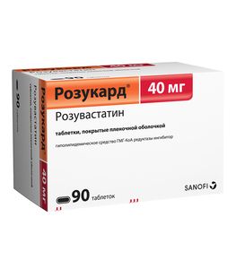 Показания к применению— первичная гиперхолестеринемия (тип IIа по Фредриксону), включая семейную гетерозиготную гиперхолестеринемию или смешанная гиперхолестеринемия (типа IIb по Фредриксону) — в качестве дополнения к диете, когда диета и другие немедикаментозные методы лечения (например, физические упражнения, снижение массы тела) оказываются недостаточными; — семейная гомозиготная гиперхолестеринемия — в качестве дополнения к диете и другой липидснижающей терапии (например, ЛПНП-аферез), или в случаях, когда подобная терапия недостаточно эффективна; — гипертриглицеридемия (тип IV по Фредриксону) — в качестве дополнения к диете; — для замедления прогрессирования атеросклероза — в качестве дополнения к диете у пациентов, которым показана терапия для снижения концентрации общего Хс и Хс-ЛПНП; — первичная профилактика основных сердечно-сосудистых осложнений (инсульта, инфаркта, артериальной реваскуляризации) у взрослых пациентов без клинических признаков ИБС, но с повышенным риском ее развития (возраст старше 50 лет для мужчин и старше 60 лет для женщин, повышенная концентрация С-реактивного белка ( 2 мг/л) при наличии, как минимум, одного из дополнительных факторов риска, таких как артериальная гипертензия, низкая концентрация Хс-ЛПВП, курение, семейный анамнез раннего начала ИБС).Применение при беременности и кормлении грудьюРозукард противопоказан при беременности и в период лактации (грудного вскармливания). Применение препарата Розукард у женщин репродуктивного возраста возможно только в случае применения надежных методов контрацепции и если пациентка информирована о возможном риске лечения для плода. Поскольку холестерин и вещества, синтезируемые из холестерина важны для развития плода, потенциальный риск ингибирования ГМГ-КоА-редуктазы превышает пользу от применения препарата во время беременности. В случае диагностирования беременности в процессе терапии препаратом прием препарата Розукард следует немедленно прекратить, а пациентка должна быть предупреждена о потенциальном риске для плода. При необходимости применения препарата в период лактации, учитывая возможность нежелательных явлений у грудных детей, следует решить вопрос о прекращении грудного вскармливания.СоставРозувастатин кальция 41.6 мг, что соответствует содержанию розувастатина 40 мг Вспомогательные вещества: лактозы моногидрат — 240 мг, целлюлоза микрокристаллическая — 181.6 мг, кроскармеллоза натрия — 4.8 мг, кремния диоксид коллоидный — 2.4 мг, магния стеарат — 9.6 мг. Состав пленочной оболочки: гипромеллоза 2910/5 — 10 мг, макрогол 6000 — 1.6 мг, титана диоксид — 1.3 мг, тальк — 1.9 мг, краситель железа оксид красный — 200 мкг.